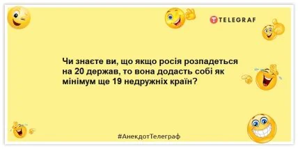 Даже война в Украине, которая идет уже 34-й день, не заставляет украинцев унывать и "расклеиваться". Украинский народ "воюет" с оккупантами не только оружием, но и юмором. Ранее мы уже делились с вами подборкой шуток о санкциях в россии, а сегодня собрали подборку анекдотов про рф и россиян.