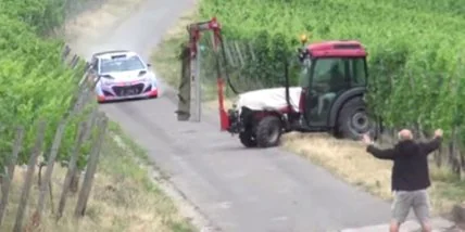 На тестовых заездах ралли Германии трактор преградил дорогу автомобилю бельгийского гонщика Тьерри Нейвилля (Thierry Neuville) из команды Hyundai.