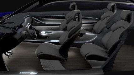 Четыре кресла в салоне разделены сплошным высоким тоннелем. Интерьер примечателен также ровным полом и обилием светодиодной подсветки, а еще — большим тачскрином спереди, который служит одновременно дисплеем мультимедийного комплекса и органом управления прочими системами.