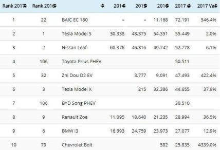 Согласно данным по мировым продажам за январь-ноябрь 2017 года, возглавляет рейтинг самых продаваемых электромобилей неизвестный в Украине BAIC EC180.