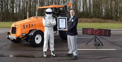 Трактор попал в Книгу рекордов Гиннеса, показав максимально возможную скорость. Рекорд поставил "неизвестный" пилот Стиг, который выступает в популярном телевизионном шоу Top Gear всегда в гоночном шлеме и не показывает своего лица.Небольшой с виду колесный трактор, который в данном случае стал похож на драгстер, сумел показать максимальную скорость 140,44 км/ч. Если быть точным, то это средний показатель, который высчитали из результатов двух заездов, где трактор показал 147,93 км/ч и 132,97 км/ч. Трактор, который попал в Книгу рекордов Гиннеса, был доведен до ума командой технарей из Top Gear. Машину оснастили 5,7-литровой "восьмеркой" от Chevrolet, выдающей 507 л. с. Появилась регулируемая пневмоподвеска, а также более мощные тормоза.