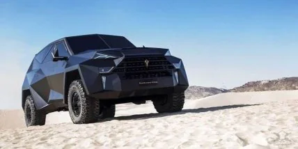 Кузов шестиметровой угловатой махины выполнен из армированного стекловолокна, а для отделки салона использована кожа, вставки под золото и деревянные панели.