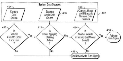 Патент описывает работу системы, которая использует данные с камер, датчика поворота руля и ультразвуковых сенсоров, а необходимость автоматической индикации поворота определяет вычислительной платформой и заложенными в ней диапазонами значений угла поворота рулевого колеса. При этом бортовая система сможет определять, собирается автомобиль сменить полосу движения или выполнить поворот.