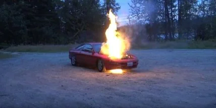 В какой-то момент из выхлопной трубы начали вырываться языки пламени, а затем загорелся двигатель – именно такого эффекта, кажется, и ожидали юные экспериментаторы.
