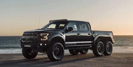 Hennessey VelociRaptor 6×6. Американское тюнинг-ателье Hennessey сделало на базе Ford F-150 Raptor внедорожник весьма внушительных размеров. Пикап стал мощнее на 150 лошадок, а также получил третью пару ведущих колес. Под капотом у этого зверя движок EcoBoost объемом 3.5 литра, который доработан до мощности 605 л.с. Этот автомобиль очень редкий, потому что всего их произвели 50 штук. Ценник на этот внедорожник начинается с отметки 350 000 $.