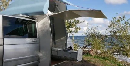 Немецкая компания Queensize Camper разработала и выпустила в продажу выдвижную кухню, которая может складываться, разбираться и трансформироваться, в результате чего салон автомобиля и пространство возле него превращаются в уютный дом.