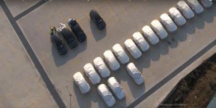 Дрон, запущенный на днях местным ютубером, зафиксировал 40 автомобилей Tesla Model Y, из которых четыре не успели накрыть защитными чехлами.