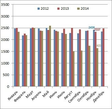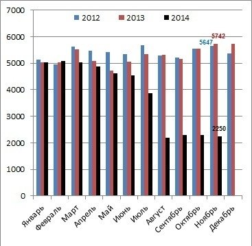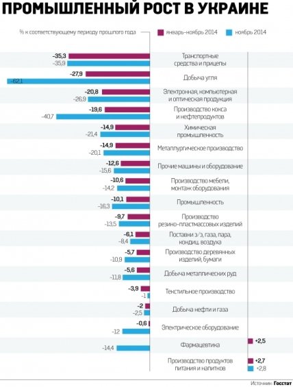 А вот в Луганской области в ноябре 2014 года промышленное производство сократилось в 5,5 раз по сравнению с аналогичным месяцем прошлого года, в Донецкой — в 2,05 раза, в Сумской — в 1,24 раза.