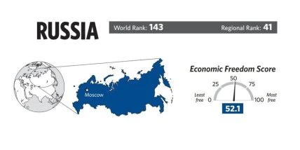 Россия опустилась на три позиции в рейтинге стран с самой свободной экономикой, заняв в нем 143-е место из 178-ми возможных. Ежегодный список, подготовленный американской организацией Heritage Foundation («Фонд наследия»), опубликован на ее сайте.