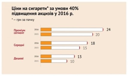 "Предложенное повышение акциза на табак с 2016 года будет даже ниже ожидаемого годовой уровень инфляции, который за январь-август 2015 уже составляет 38,2%. Сейчас на все сигареты, которые дешевле 15,4 грн за пачку, ставка акциза составляет 6,08 грн. На дорогие сигареты ставка акциза лишь на 1 грн выше. Рост акциза на 40% означает, что минимальная ставка акциза на пачку сигарет вырастет на 2,43 грн — до 8,51 грн за пачку", — отмечают в центре.