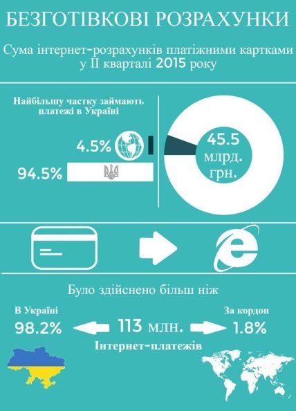 Как отмечается, во втором квартале 2015 года Интернет-платежи с использованием платежных карточек составили более 45 млрд гривен. "Более 111 млн операций на общую сумму почти 43 млрд гривен было осуществлено в Украине, а в зарубежных Интернет-магазинах - менее 2 млн платежей на сумму 2,5 млрд гривен", - говорится в сообщении.