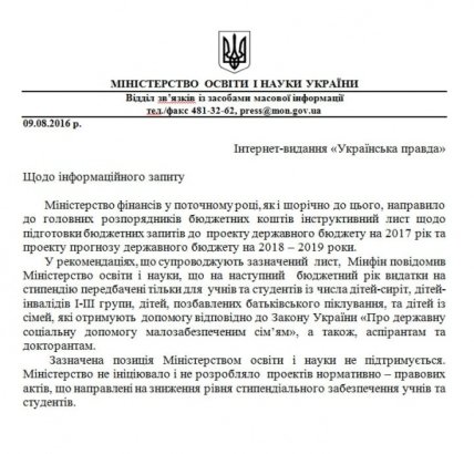 В рекомендациях, сопровождающих письмо, сказано о сокращении расходов на стипендии. "Минфин сообщил Министерство образования и науки, что на следующий бюджетный год расходы на стипендию предусмотрены только для учеников и студентов из числа детей-сирот, детей-инвалидов i-III группы, детей, лишенных родительской опеки, и детей из семей, которые получают помощь согласно Закону Украины "О государственной социальной помощи малообеспеченным семьям", а также, аспирантам и докторантам", – говорится в ответе МОН.
