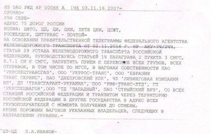 Запрет выдан на основании правительственной телеграммы Федерального агентства железнодорожного транспорта от 2 ноября 2016 года, пишет издание."Запретить прием к перевозке всех грузов, всех отправок в том числе по МСГП, в вагонах собственности ПАО "Укрспецтрансгаз", ООО "Укррос-Транс", ООО "Евразия Транс Сервис", ПАО "Днепровский КПК", ЧП "Лизинговя компания ВЛ", ДП "Трансгарат- Украина", ООО "Риф-Транс-ЛТД", ГП "Укрспецвагон", ООО "ТД "Западный", ПАО "Стрыйский ВРЗ", со всех станций РФ и транзитом через территорию России в другие государства, в адрес всех грузополучателей с момента получения и до отмены, кроме порожних вагонов указанных владельцев, следующих в направлении Украины", - говорится в телеграмме.