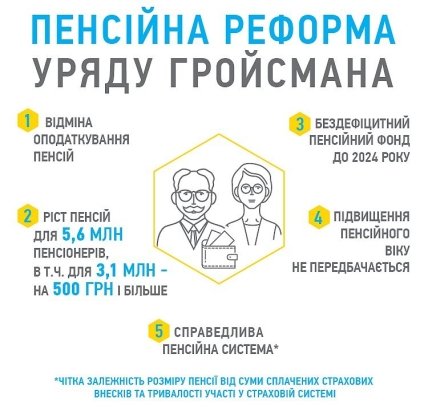 "Приблизительно 1 миллион 308 тысяч граждан получат повышение пенсий до 200 гривен. 1 миллион 208 тысяч граждан получат повышение, при сегодняшнем курсе валют, от 200 до 500 гривен ежемесячно. 1 миллион 903 тысячи граждан получат повышение от 500 до 1000 гривен на месяц. Это не разовая подачка, которую некоторые политиканы пытались делать, – это постоянная система. И еще 1 миллион 109 тысяч граждан получат более 1000 гривен ежемесячной доплаты", – уточнил Гройсман.