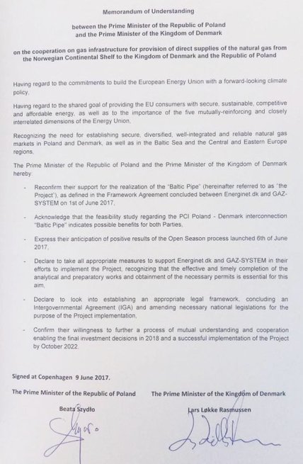 Гройсман объяснил, кто сможет выйти на пенсию в 60Напомним, Польша и Дания подписали в Копенгагене меморандум о совместной реализации проекта Baltic Pipe (Балтийский трубопровод). Документ предусматривает принятие окончательного решения по реализации инвестиции в 2018 году и завершение строительства газопровода до октября 2022 года.