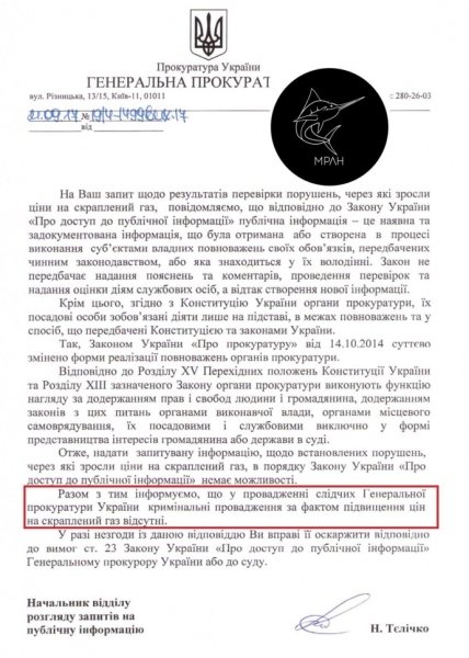 Генеральная прокуратура Украины (ГПУ) не открывала уголовных производств по факту повышения цен на сжиженный газ.