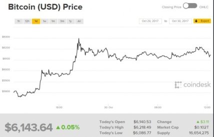 К утру понедельника, 30 октября цена биткоина снова немного снизилась, и сейчас он торгуется около 6125 долларов.