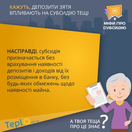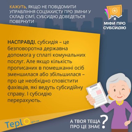 Миф 1: Если не сообщить управлению социальной защиты о том, что зять совершил покупку, превышающую 50 тыс. грн, субсидию тещи отменят.