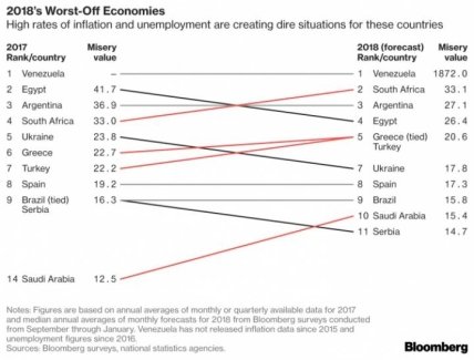 Индекс рассчитывается агентством Bloomberg на основе прогнозов экономистов по инфляции и безработице для 66 стран.