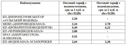 тарифы на централизованное водоснабжение и водоотвод лицензиатам НКРЭКУ, которые реализуют воду другим предприятиям водопроводно-канализационного хозяйства (то есть оптовые тарифы) за 1 куб. м: