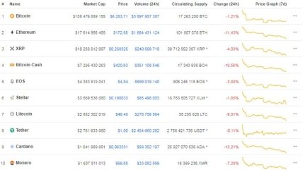 Bitcoin подешевел на 1,21% до $6 283, капитализация 108, 476 млрд долларов.