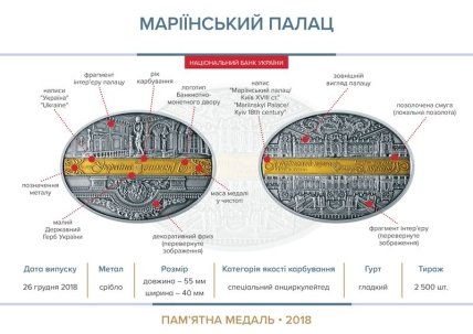 26 декабря 2018 года Национальный банк Украины (НБУ) выпустит памятную медаль "Мариинский дворец" в честь памятнику архитектуры, построенному в стиле барокко. Об этом сообщает пресс-служба Нацбанка.