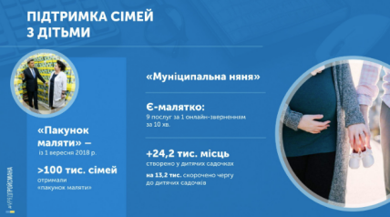 Поддержка семей с детьми. С 1 сентября 2018 года работает программа "Пакет малыша" и уже более 100 тыс. семей получили помощь. Внедряем "Муниципальную няню", благодаря программе родители смогут частично компенсировать услуги няни. Создано 24,2 тыс. мест в детских садах.