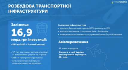 Дорожная инфраструктура. 2018 году железная дорога ввела в эксплуатацию 3,5 тыс. новых грузовых вагонов. Открыт Бескидский тоннель, модернизирован участок Камыш–Заря – Волноваха – важный узел на юге. Пассажиропоток аэропортов вырос до 20 млн пассажиров.