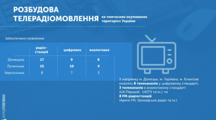 Развитие телерадиовещания на временно оккупированных территориях. Обеспечено вещание 17 радиостанций в Донецкой области, 15 - в Луганской. Также в Донецкой области работают 9 цифровых и 6 аналоговых телеканалов. В Луганской области - 10 и 4 соответственно.