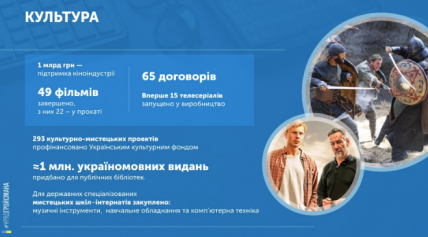 Культура. На поддержку украинского кино направили 1 млрд грн. Уже завершено производство 49 фильмов, из них 22 – в прокате, подписано 65 договоров на производство новых лент. Впервые запущен в производство 15 телесериалов. Около 1 млн украиноязычных изданий приобрели для публичных библиотек.