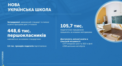 Новая украинская школа. Утвержден государственный стандарт образовательных програм для 1-4 классов. Около 448,6 тыс. первоклассников учатся по новым стандартам, подготовлен 2,1 тыс. тренеров–педагогов, 105,7 тыс. педагогических работников работают по новым методикам.