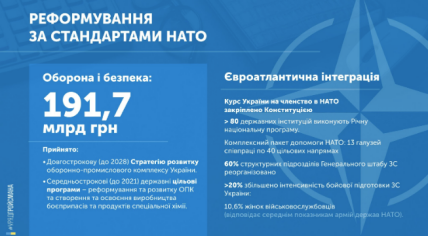 Реформирования по стандартам НАТО. Принята долгосрочная Стратегия развития оборонно-промышленного комплекса. Курс Украины на членство в НАТО закреплено в Конституции. Около 60% подразделений Генштаба ВСУ реорганизован, на 20% увеличена интенсивность боевой подготовки ВСУ.