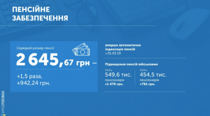 Пенсионное обеспечение. Средний размер пенсии вырос в 1,5 раза. В 2019 году состоится первая автоматическая индексация пенсий. В прошлом году пенсии были повышены на 1476 грн для 550 тыс. военных пенсионеров.