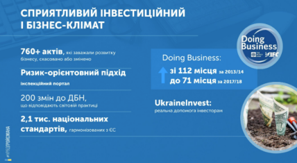 Инвестиции. Правительство отменило более 700 нормативов, ввело новые строительные нормы, изменило систему надзора. Ежегодно рейтинг Украины растет в Doing Business и имеет амбициозный план войти в ТОП-50.