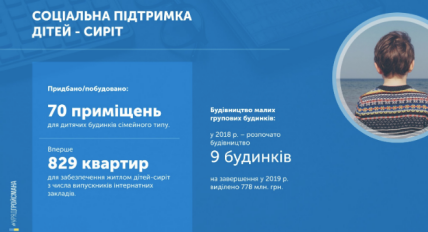 Поддержка детей-сирот. Приобретено или построено: 70 помещений для детских домов семейного типа, 829 квартир для обеспечения жильем детей-сирот. В 2018 году начато строительство 9 малых групповых домов.
