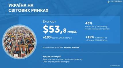 Экспорт. Украинский продукт занимает достойное место на мировом рынке. За 2018 год имеем более 53 млрд долларов экспортной выручки. Доля ЕС в общем объеме внешней торговли – 43%. Расширяем режим свободной торговли с Канадой, Израилем и другими странами.