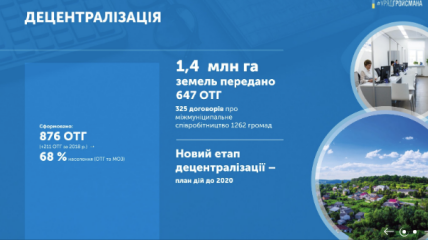 Децентрализация. 68% населения Украины живут в ОТГ. Правительство начинает новый этап реформы – четкое разграничение полномочий, новый территориальное устройство и использование форм местной демократии.