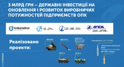 Безопасность и оборона. 3 млрд грн – государственные инвестиции на обновление и развитие производственных мощностей предприятий ОПК. Реализованы проекты "Ольха", "Нептун", БТР-3, БТР-4. 8 тысяч единиц новой и модернизированной военной техники поставлено армии.