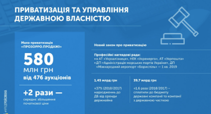 Приватизация. Доходы от аренды госимущества увеличились на 37%, платежи госкомпаний в бюджет выросли в 1,6 раз. Летом 2018 года стартовала "МалаПриватизація". За несколько месяцев 2018 года доходы от малой приватизации превысили 580 млн грн. Цены на аукционах растут в среднем вдвое.