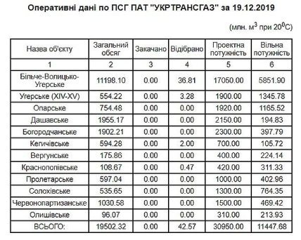 Запасы природного газа в подземных хранилищах (ПХГ) Украины уменьшились до 19,5 млрд куб. м. Данные за 19 декабря 2019 года опубликовала сегодня пресс-служба государственной компании "Укртрансгаз".