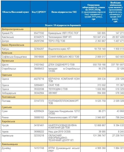 "Нафтогаз сообщает, что ненадлежащие расчеты таких предприятий за газ создают угрозу для теплоснабжения потребителей в 18 населенных пунктах в отопительный период. Компания письменно сообщила эти предприятия о необходимости проведения срочных расчетов во избежание прекращения газоснабжения с 1 февраля 2020 года. "Нафтогаз" не имеет права поставлять природный газ тепловикам, которые ненадлежащим образом выполняют график расчетов", - отметили в компании.