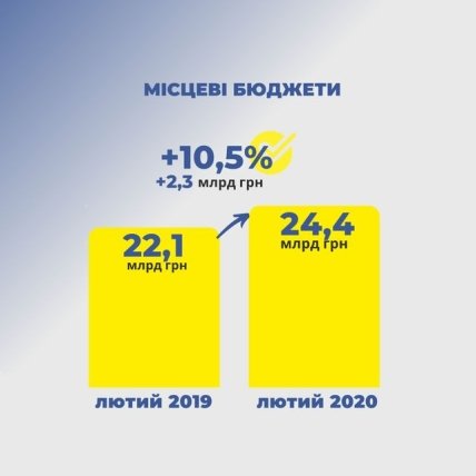 Местные бюджеты получили 24,4 млрд гривень. Это на 2,3 млрд грн, или 10,5%, больше, чем в феврале 2019 года.