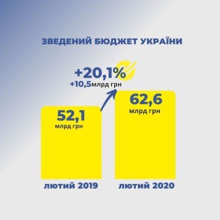 Поступления в сводный бюджет в феврале 2020 года составили 62,6 млрд гривень, что на 10,5 млрд грн, или 20,1% больше, чем в феврале 2019 года.