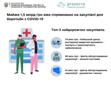 Самой дорогой закупкой против COVID-19 стала услуга по обеспечению специализированным автотранспортом медицинских учреждений, которую Центр экстренной медицинской помощи и медицины катастроф города Киева закупил за 74 млн грн. Также Центр обслуживания Национальной полиции приобрел защитные костюмы, медицинские перчатки и маски на 130 млн грн, центральный госпиталь МВД Украины закупил респираторы и изолированные костюмы за 46 млн грн, Днепропетровская ОГА закупила аппаратов искусственной вентиляции легких на 35 млн грн.