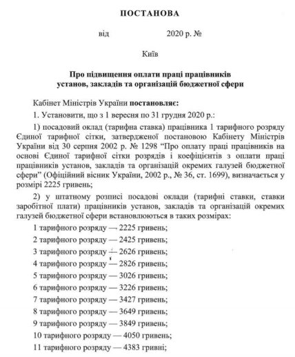 Документ предусматривает повышение должностного оклада (тарифной сетке) работника 1-го тарифного разряда определяется в размере 2 225 гривен, 2-го разряда - 2 425 гривен, 3-го - 2 626 гривен, 4-го - 2 826 гривен, 5-го - 3 026 гривен.