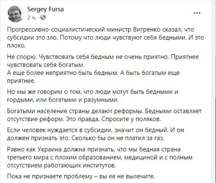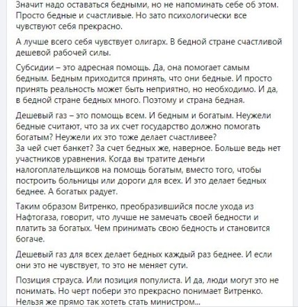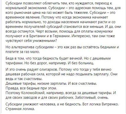 "Субсидии позволяют облегчить тем, кто нуждается, переход к нормальной экономике. Субсидии – это адресная помощь тем, для кого рыночная цена на газ может быть тяжелее. Субсидии – это временное явление. Потому что когда экономика начинает работать нормально, то доходы населения начинают расти и со временем получателей субсидий становится все меньше. И да, они всегда останутся", - написал он.