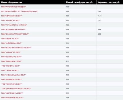 Самый низкий годовой тариф установила компания ООО "Агросинтез Трейдинг" - 7,80 гривен за кубометр. Самый высокий - ООО "Черновицкая областная энергоснабжающая компания", ООО "Киевская областная энергоснабжающая компания", ООО "Херсонская областная энергоснабжающая компания" - 13,50 гривен.