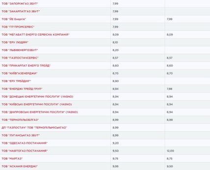 У поставщиков ООО "Йе энергия", ООО "МЕГАВАТТ ЭНЕРГО СЕРВИСНАЯ КОМПАНИЯ", ООО "ТАС ЭНЕРГИЯ СТРАНЫ" годовая и месячная цены совпадают и равны, соответственно, 7,99, 8,09 и 11,22 грн за кубометр.