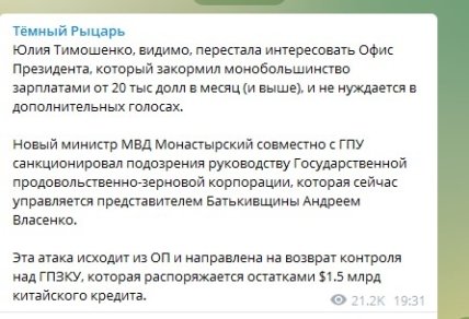 Инсайдерский Телеграм-канал "Темный рыцарь" опубликовал данные, что за задержанием стоит Офис президента.