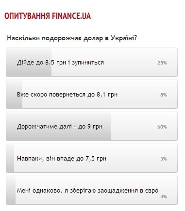 60% опрошенных читателей Finance.UA считают, что доллар будет дорожать и дальше – до 9 гривен. Еще 25% респондентов убеждены, что цена на американскую валюту остановится на отметке 8,5 грн. А 8% прогнозируют, что уже скоро стоимость доллара вернется к уровню 8,1 грн. В свою очередь 4% опрошенных хранят сбережения в евро. И только 3% респондентов верят, что доллар наоборот будет дешеветь – до 7,5 грн.